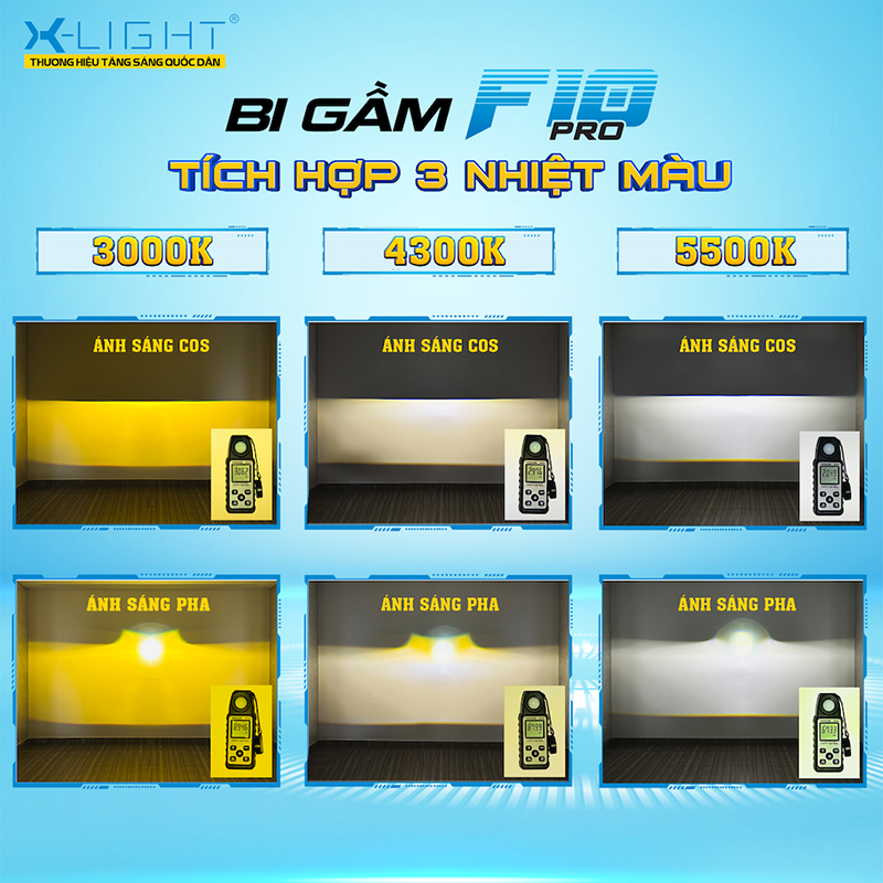 Trong phân khúc bi gầm được tích hợp 3 nhiệt màu, X-Light F10 Pro được đánh giá là bi gầm có sức mạnh ánh sáng Pha thuộc “top đầu”. Sản phẩm có chất lượng ánh sáng Pha “đột phá” nhờ được trang bị mắt trợ Pha công nghệ cao. Sự cộng hưởng của hai nguồn phát sáng: ánh sáng từ mắt trợ Pha và ánh sáng sau khi mở màn trập đã mang đến hiệu suất chiếu sáng mạnh mẽ hơn các dòng bi gầm tích hợp 3 nhiệt màu khác.