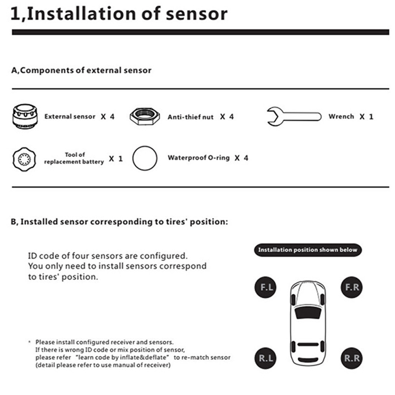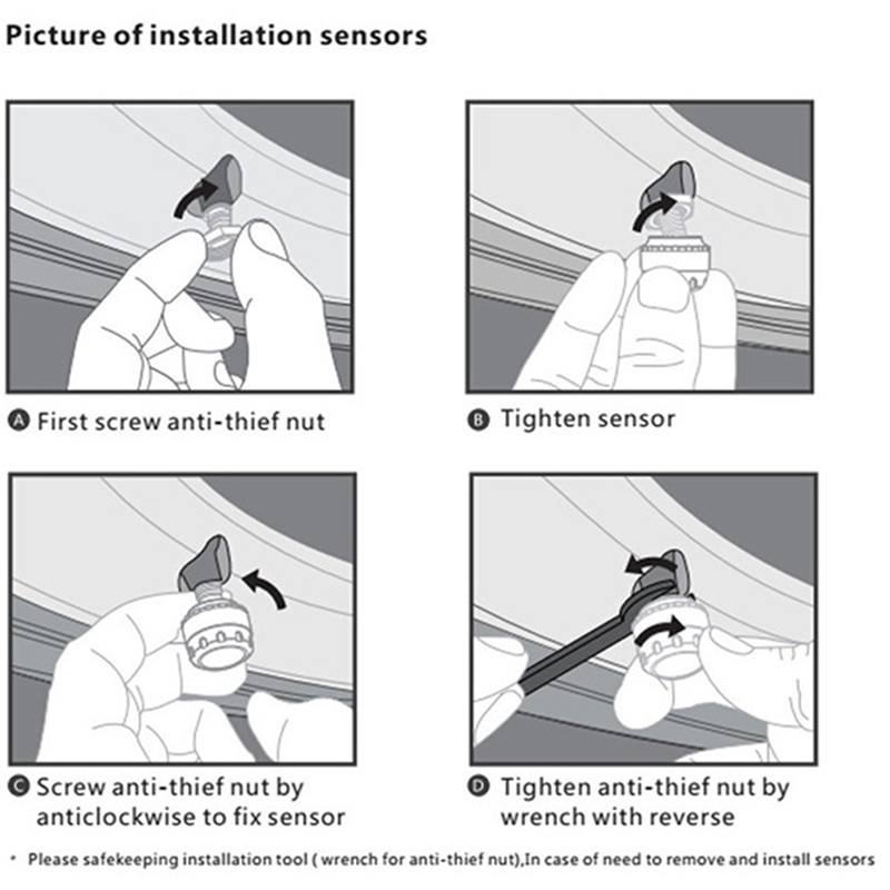 - Loại: Hệ thống giám sát áp suất lốp xe hơi không dây năng lượng mặt trời TPMS
