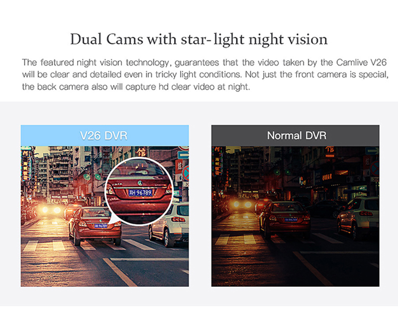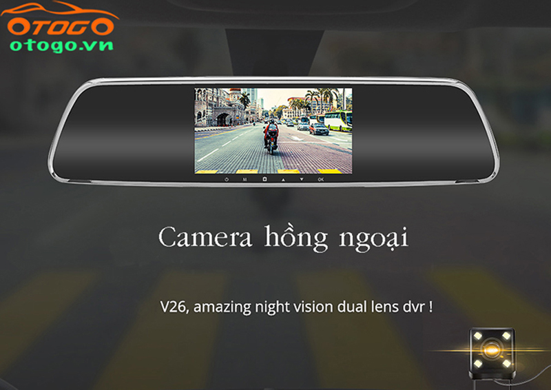 V26 trang bị 2 camera (camera hành trình và camera lùi) có thể quay phim full HD, hỗ trợ hồng ngoại, ghi hình cực nét, kể cả trong tình trạng thiếu sáng hoặc ban đêm.