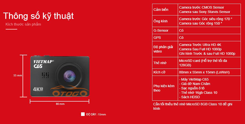 Lưu ý: VietMap C65 ghi hình với độ phân giải Full HD khi ghi hình cùng lúc trước sau.