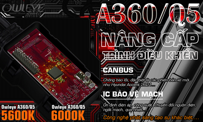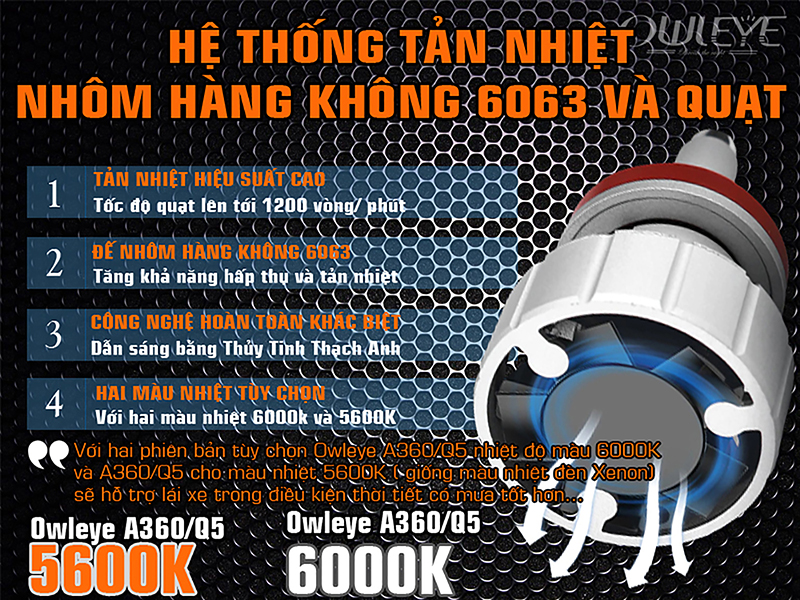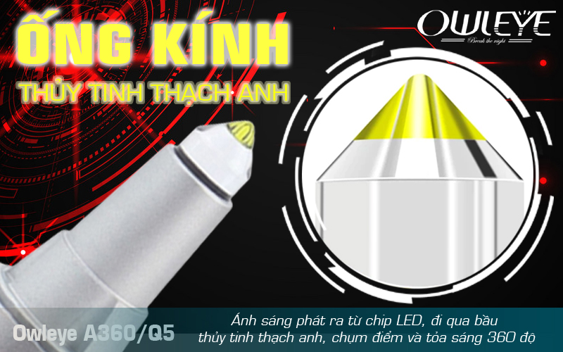Owleye A360/Q5 được phát sáng bằng công nghệ thuỷ tinh thạch anh mới nhất, giúp giảm thiểu nhiệt năng, tăng công suất và tuổi thọ bóng đèn. Khả năng chiếu sáng của sản phẩm cũng sẽ được nâng cấp một cách vô cùng mạnh mẽ và hiệu quả.