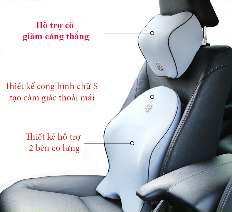 Bộ tựa lưng và gối tựa đầu bằng cao su non được thiết kế, định hình giúp nâng đỡ tối đa lưng, vai cổ gáy. Vỏ gối có khóa kéo được giấu khéo léo, có thể tháo ra để giặt sạch, phơi khô, phía sau gối là dây đai cố định dùng để lắp lên ghế ô tô một cách tiện lợi, phù hợp với mỗi người.
