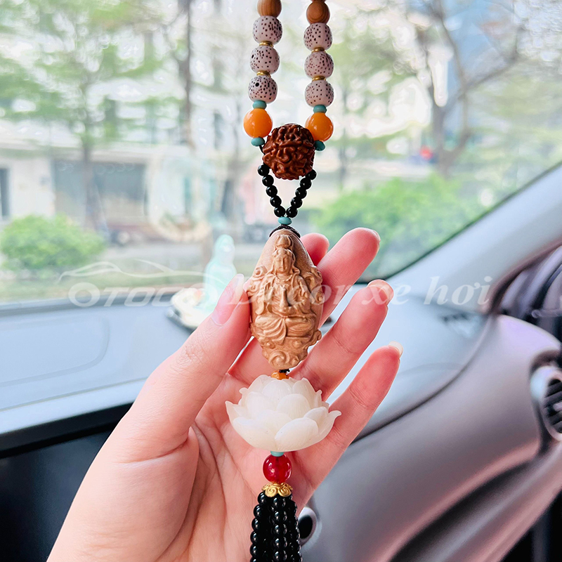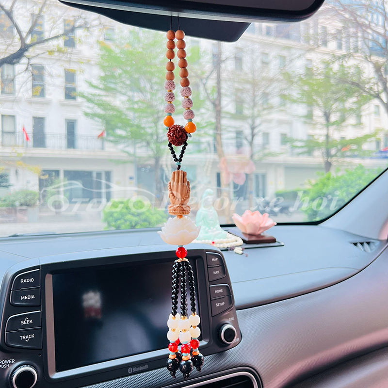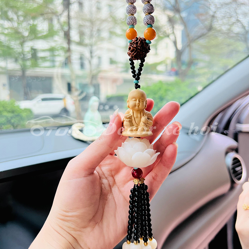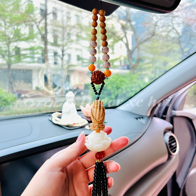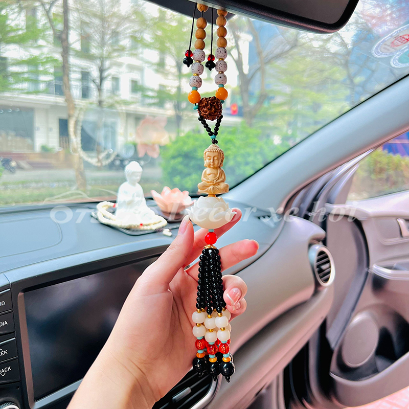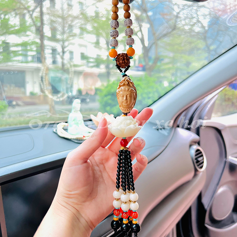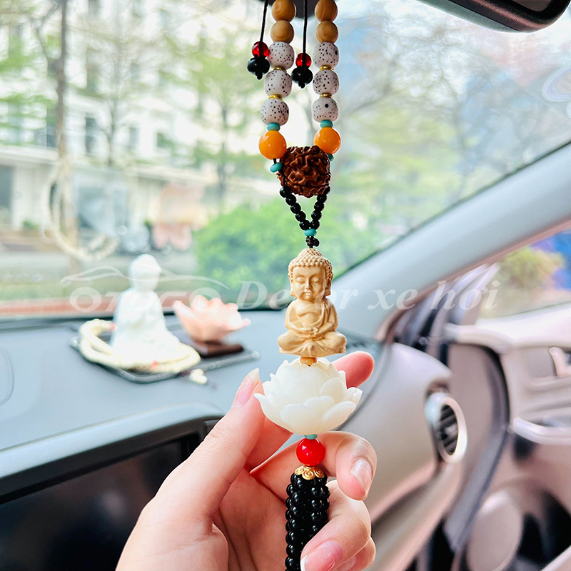 - Hình ảnh Phật được đặt khéo léo trên mặt dây giúp không gian của buồng lái luôn có sinh lực và may mắn. Những đóa sen ngọc tinh khôi biểu trưng cho tâm tính thanh tịnh, bình an trong tâm hồn.