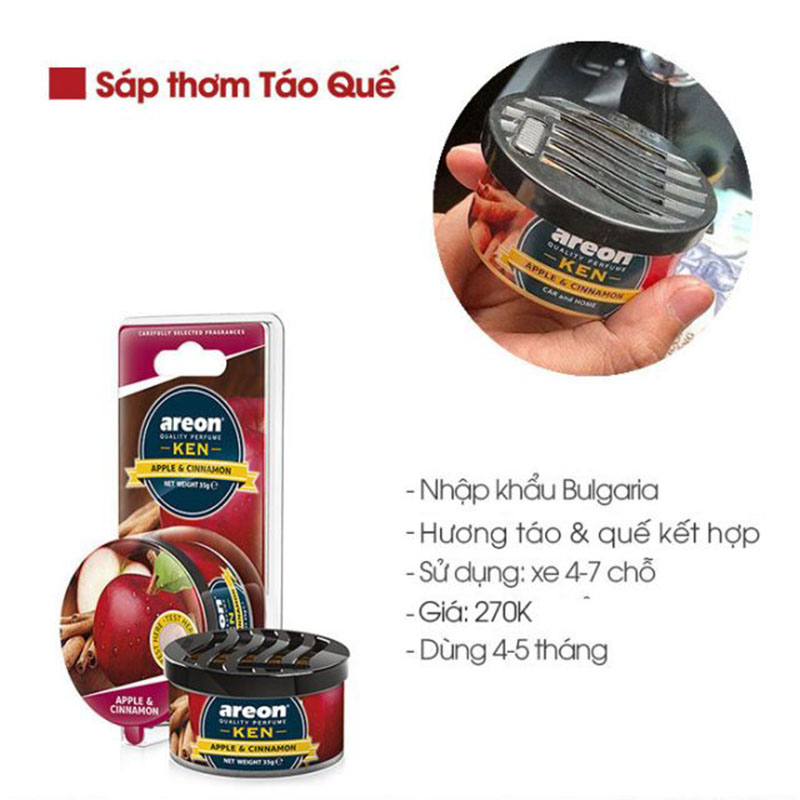 Areon Ken Apple & Cinnamon – Sáp khử mùi, làm thơm xe ô tô hương táo quế của Areon, nhập khẩu từ Bulgaria. Hương táo quế thơm mát, dùng rất dễ chịu. Bên cạnh mùi cà phê thì táo quế là mùi bán chạy nhất.