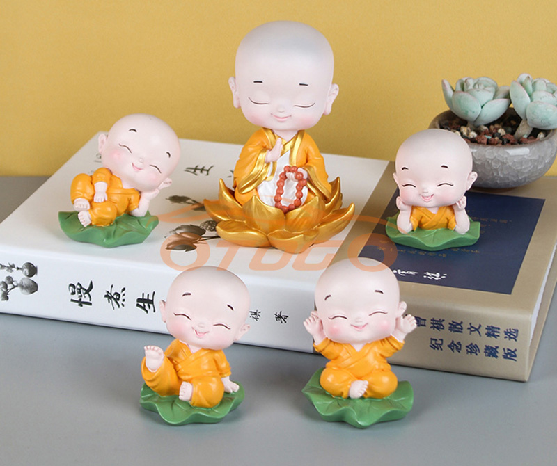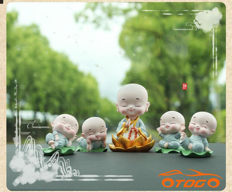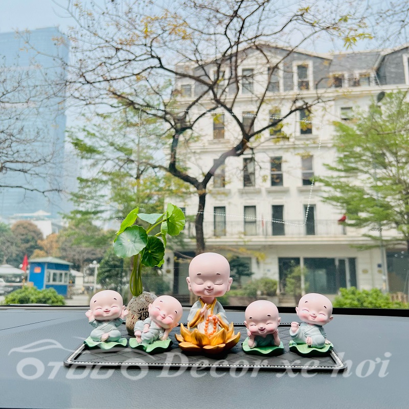 Bộ sản phẩm gồm 5 chú tiểu ngồi lá sen và thảm đính đá , bình hoa sen đá như hình :