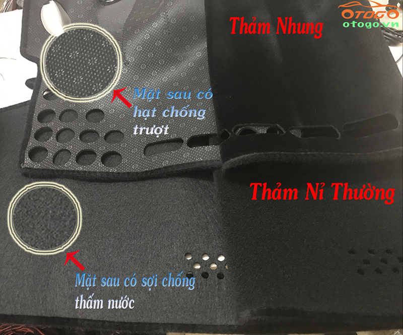 Thảm được làm từ chất liệu vải nhung mềm,mịn có độ bền cao có thể giặt sạch khi bị bám bẩn.Sản phẩm được thiết kế riêng cho từng hãng xe, đời xe đảm bảo luôn vùa khít bề mặt taplo xe, đường chỉ may chắc,tinh tế ,cùng logo được in nổi đảm bảo độ bền và nét thời trang của bề mặt thảm taplo.