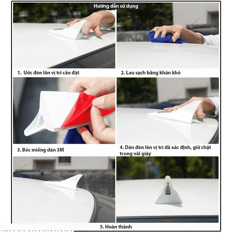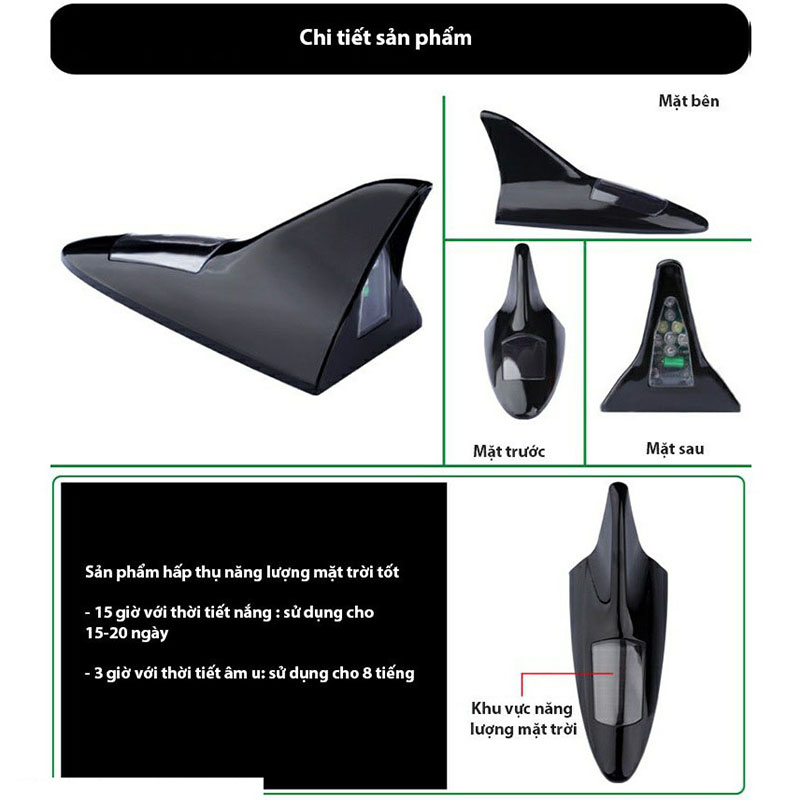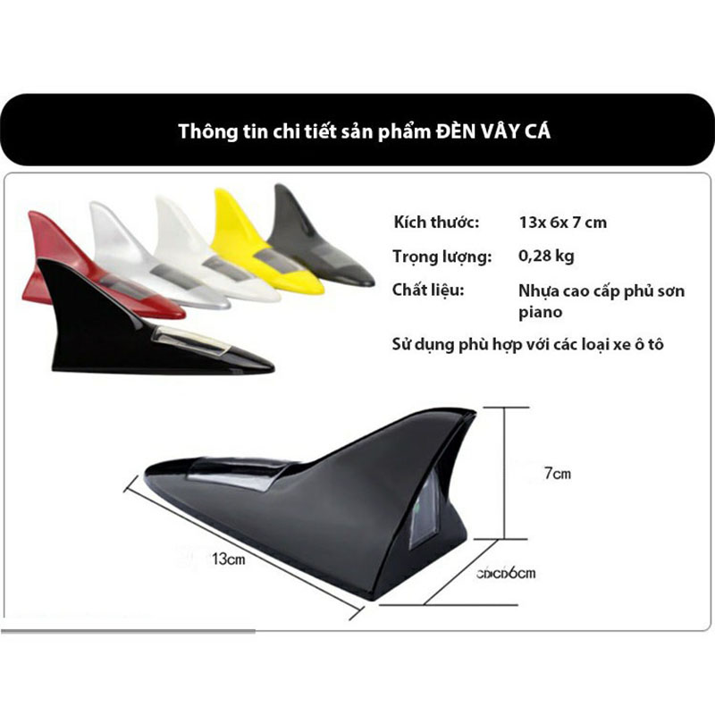 - Vây cá mập thay ăng ten có đèn led sẽ thay cho chiếc ăng ten cũ vẫn đảm bảo chức năng thu phát sóng radio. Vây cá mập có bộ phận đèn led tự động sáng khi trời tối và khi rung chấn động. Hệ thống đèn led này sẽ giúp xe cảnh báo, an toàn hơn. Hệ thống đèn led sử dụng năng lượng mặt trời, sẽ tích lũy năng lượng vào ban ngày, và sử dụng vào ban đêm. Việc lắp đặt đơn giản nhanh chóng. Chỉ cần bắt lại dây ăng ten sau đó dán vây cá mập lên bằng miếng dán 3M đi kèm. Có nhiều màu sắc để lựa chọn.